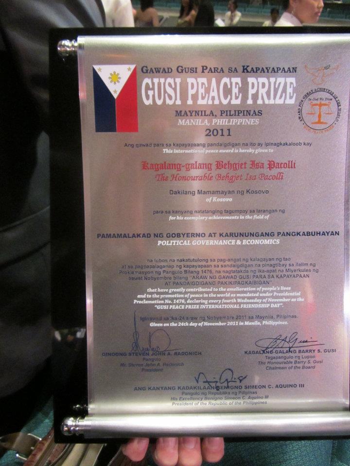 Krejt kësaj i parapriu ftesa nga autoritetet filipineze se Komiteti i Çmimit të Paqes Gusi në Manila, kishte vendosur të më nderoi me Çmimin e Paqes “Gusi Peace Prize”.