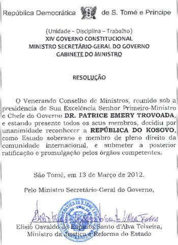 Gjatë vizitës së fundit në Sao Tome, me 21 nëntor 2011, zëvendëskryeministri Pacolli gjatë takimeve me kryeministrin  Dr.Patrice Emery Trovoada dhe ministrin e punëve të Jashtme z.Manuel Salvador Dos Ramos pati marrë konfirmimin se njohja e Republikës së Kosovës nga Sao Tome do të vinte shumë shpejt.