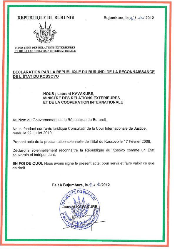 Nota verbale e njohjes i është dorëzuar zëvendëskryeministrit të Kosovës, z.Behgjet Pacolli nga ministri i punëve të Jashtme të Burundit z. Laurent Kavakure, në kryeqytetin këtij shteti, Bujumbura.