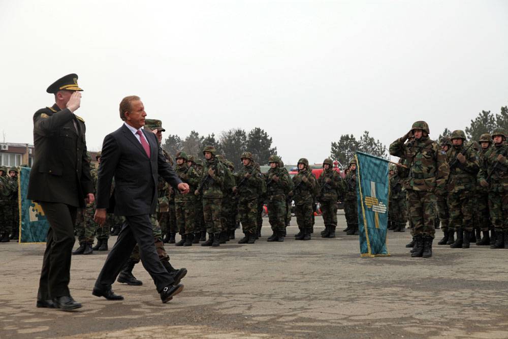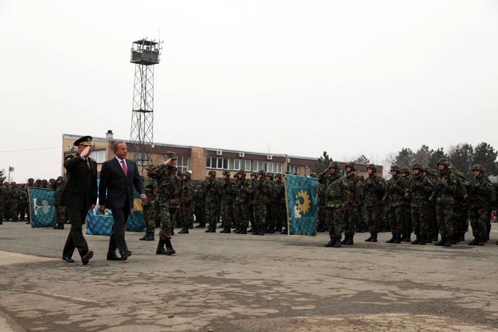 I shoqëruar nga komandanti i Forcës së Sigurisë së Kosovës, gjenerallejtënant Sylejman Selimi, duke parakaluar para Gardës së FSK-së.