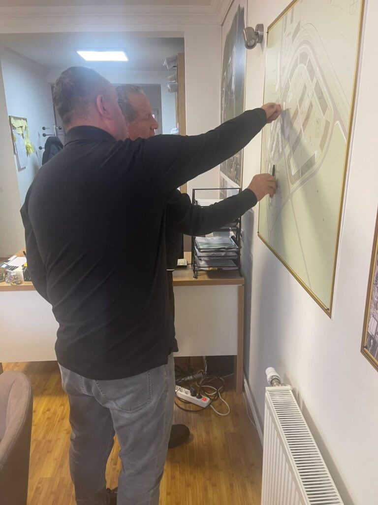 Presidenti dhe themeluesi i kompanisë globale “Mabetex Group”, Behgjet Pacolli duke projektuar punëm dhe Driton Gërbeshi, (CEO i Albanica Homes), me entuziazem duke dëgjuar para se të implementojë atë çfarë u proejktua.