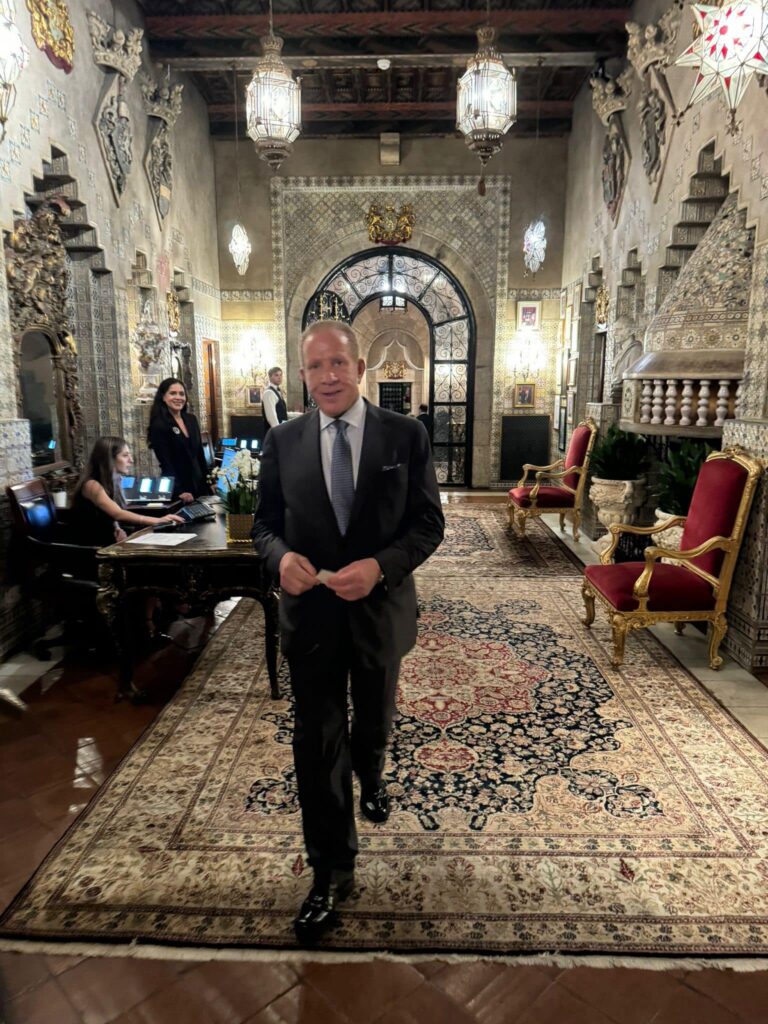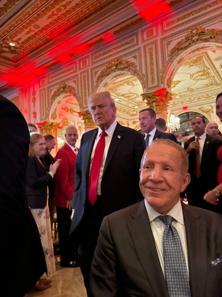 Në foto me Presidentin e posazgjehdur të SHBA-së, Donald Trump, duke festuar pasi ai mori një fitore të merituar karshi Kama Harris. Unë isha i ftuar special në Mar-a-Lago, një vend me dekor të zbukuruar me detaje të arta dhe të kuqe, që japin një atmosferë madhështore dhe festive.