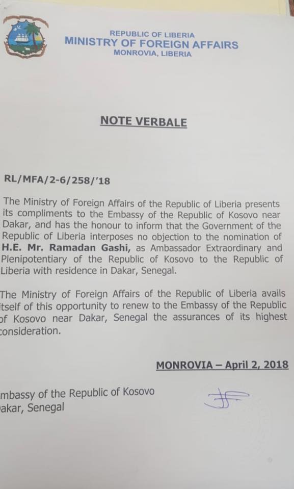 Ndihem mirë që vetëm një ditë pas vizitës time ne Monrovia të Liberisë, mora notën verbale më të cilën ky shtet përgjigjet në favor të Kosovës për akreditimin e Ambasadorit tonë jorezident ( Ramadan Gashin nga Senegali) në këtë shtet.