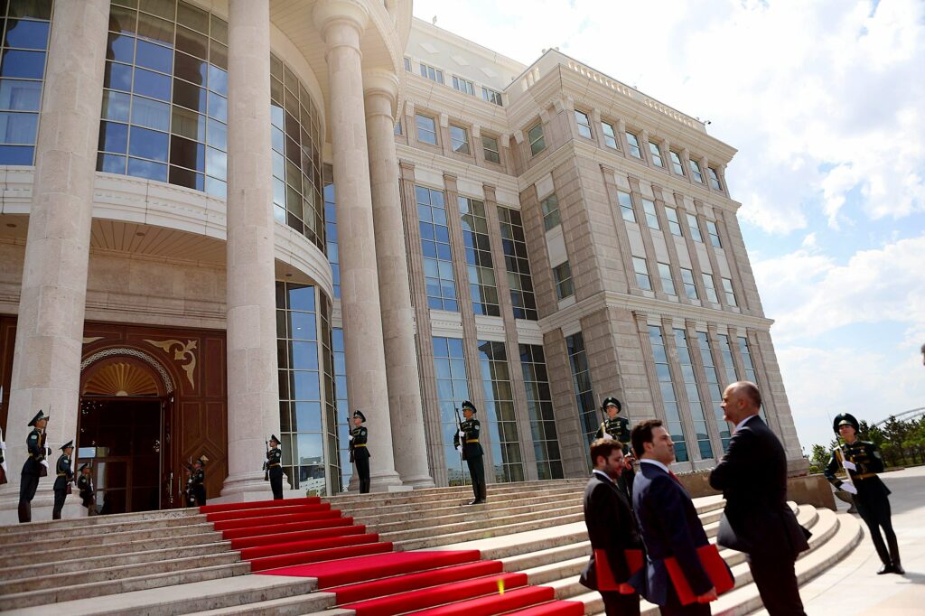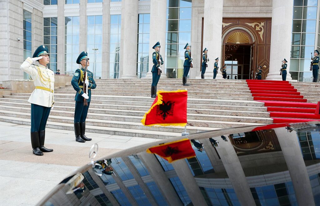 Pritja protokolare e kryeministrit të Republikës së Shqipërisë, Edi Rama, nga presidenti i Kazakistanit, Nursultan NNazarbayev.Para objektit presidencial të Kazakistanit, ku pritja protokollare ishte organizuar në mënyrë të përsosur nga presidenti Nursultan Nazarbayev. Edhe kjo ndërtesë është ngritur nga kompania Mabetex dhe duartë e puntorëve shqiptar. Një qytet në stepat – Astana u bë kryeqyteti i Kazakistanit në vitin 1997. Pjesa më e madhe e arkitekturës së tij moderne është mahnitëse në shkallën dhe dizajnin e saj, veçanërisht në kontrast me stepat e gjera dhe të hapura që e rrethojnë atë.