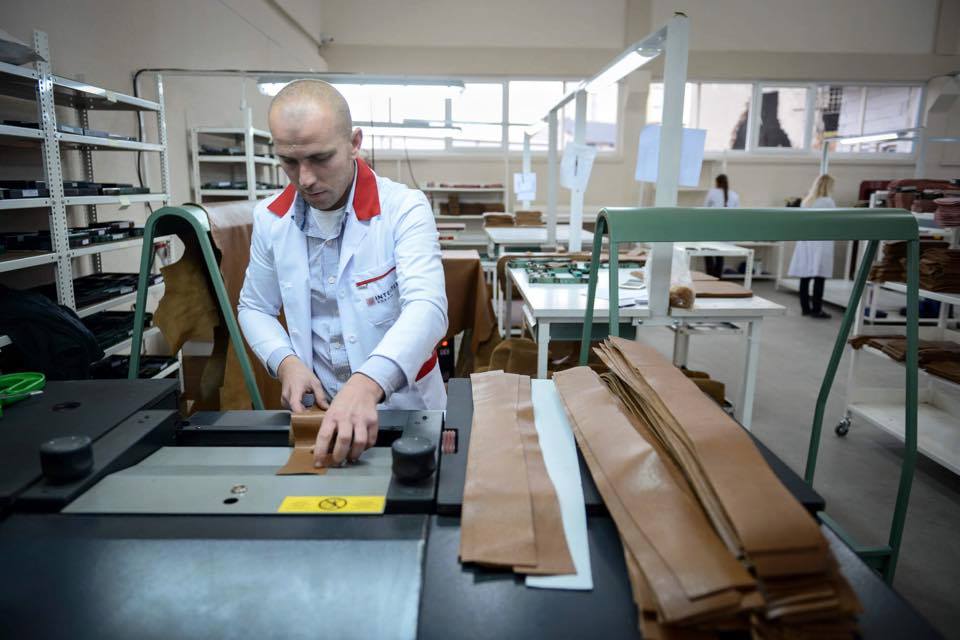 Një nga punëtorët e linjës së re të prodhimit të çantave në fabrikën e tekstilit Intertex.