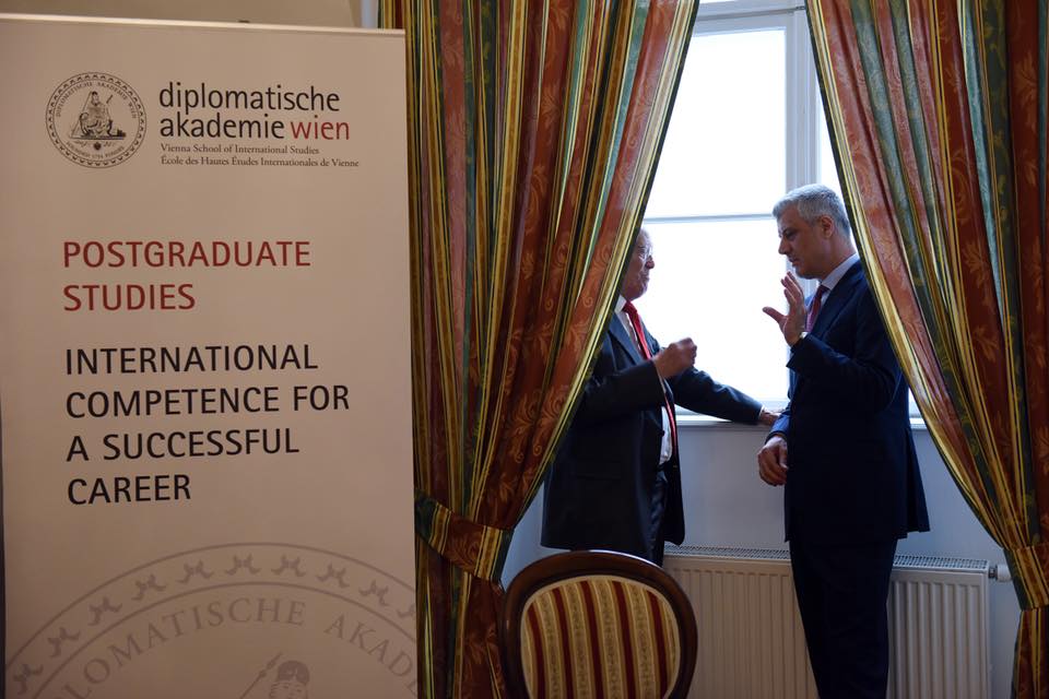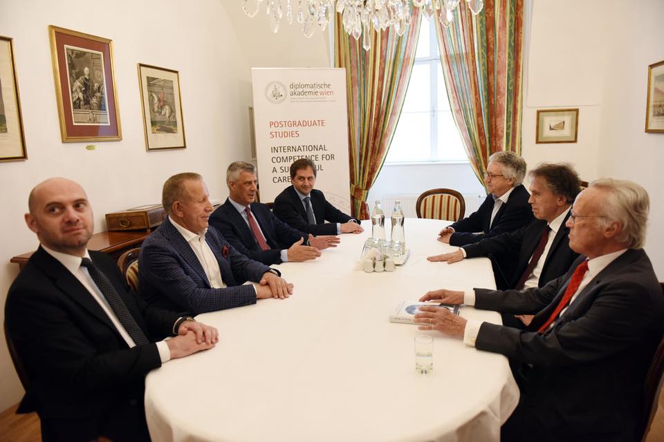Vjenë, 30 maj 2018 – Në takim me ambasadorët Albert Rohan dhe Wolfgang Petrisch, pak para promovimit të librit biografik “New State, Modern Statesman”, në Akademinë Diplomatike të Vjenës.