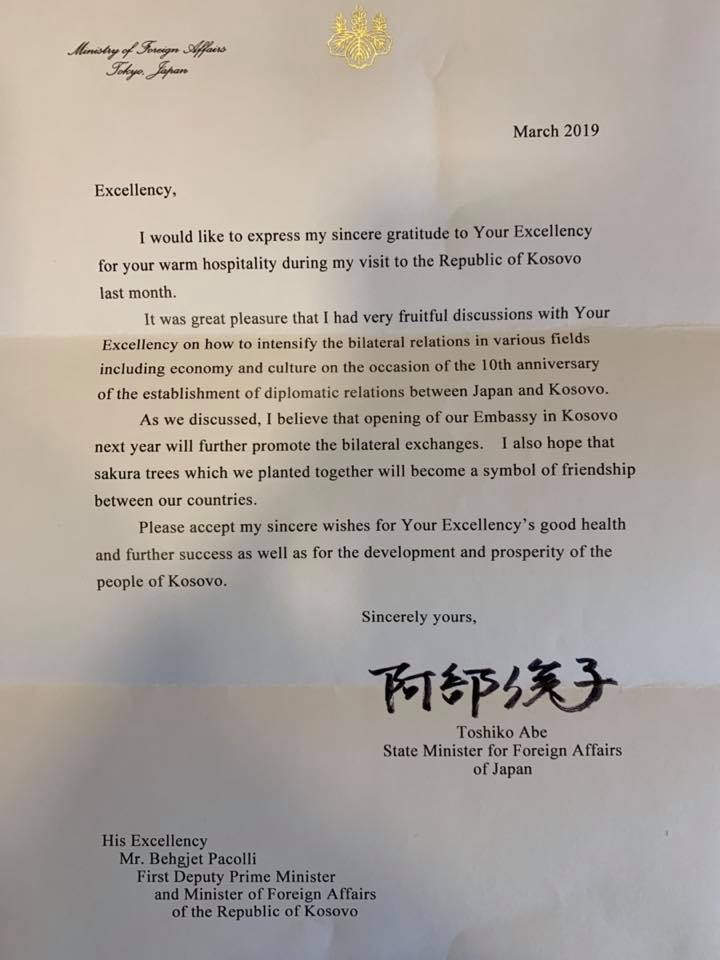 Gjithmonë i lumtur kur pranoj letra që ri-theksojnë përkrahjen e fuqishme të vendeve nga katër anët e botës. Sot pranova urimet më të përzemërta nga znj.Toshiko Abe, Ministre Shtetërore e Punëve të Jashtme të Japonisë, ku theksohet rëndësia e shënimit të dhjetëvjetorit të vendosjes së marrëdhënieve diplomatike mes Japonisë dhe Kosovës. Ministrja Abe e afirmon tutje diskutimin që kemi pasur bashkë, për hapjen e Ambasadës Japoneze në Republikën e Kosovës vitin që vjen, duke ri-theksuar atë cfarë kemi diskutuar bashkë, që hapja e Ambasadës do të shënoj një momentum të rid he të fuqishëm në thellimin e marrëdhënieve, edhe ashtu të shkëlqyera mes dy vendve tona. Japonia ka qenë dhe mbetet përkrahëse e fuqishme në kontinentin aziatik, dhe ne do t’i jemi përjetësisht mirënjohës këtij vendi.