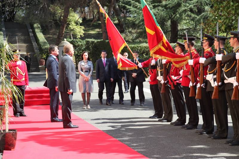 Presidenti Pacolli dhe delegacioni zyrtar që e shoqëron në këtë vizitë u prit në Pallatin e Brigadave nga Presidenti i Republikës së Shqipërisë, Bamir Topi, me një ceremoni madhështore solemne, ku u ekzekutuan himnet kombëtare të të dy vendeve dhe u kalua në revistë Truproja e Nderit.