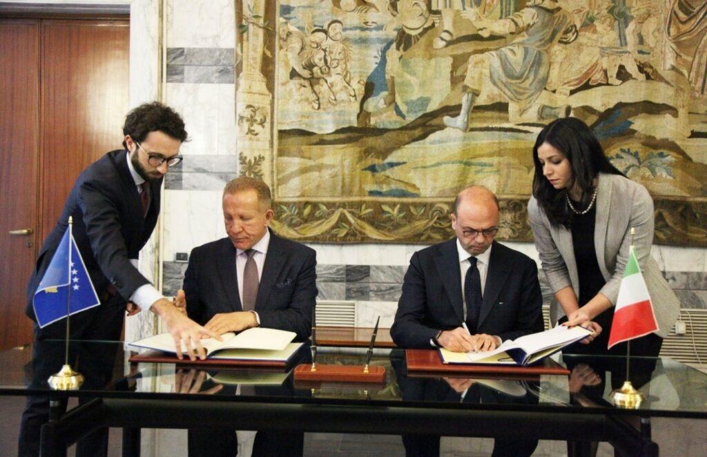 Romë, 25 janar 2018 –Gjatë nënshkrimit të Marrëveshjes dypalëshe në mes të Kosovës dhe Italisë me ministrin e Jashtëm italian, Angelino Alfano.Romë, 25 janar 2018 – Takim bilateral në mes të delegacionit nga Ministria e Punëve të Jashtme e Republikës së Kosovës dhe Ministrisë së Punëve të Jashtme të Republikës italiane.